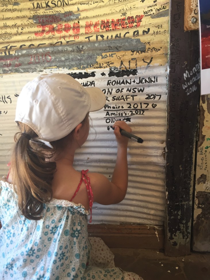 From Bourke we headed to the Paroo-Darling National Park after stopping at the Tilpa pub for a quick fix of hot chips and a beer on the way. The kids got to write on the walls of the pub which they loved. Not long after leaving the pub, we had our own Wizard of Oz moment as we drove straight through the middle of a willy willy. For a moment all we could see was dust and leaves as the whole car was engulfed by this swirling mass of debris. Fortunately we didn’t end up in some magical land but just continued on our way.