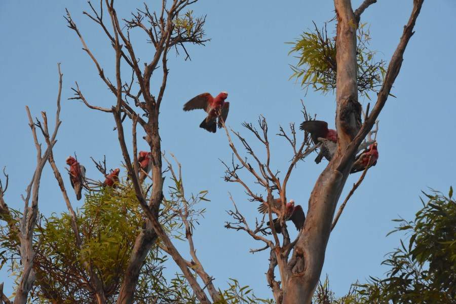 A flock of galahs at dusk