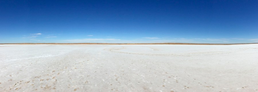 We finally pushed on, and as we continued along the track, we noticed white patches on the ground that spread out on each side of us. We tried to convince the kids it was snow but they didn’t buy it. That morning we had told them that we would be visiting Lake Eyre today and they had been excited about it all morning, so these white glimpses helped fend off the boredom of this stretch of the drive as the anticipation grew. Before long, we could see the mirage like mirror on the horizon – Lake Eyre was up ahead, but there was just one issue – how did we find and access the edge of it so we could head out and explore it. We wanted to get as close as possible so we didn’t have to walk too far in the extreme heat, but if we drove too close we would risk getting bogged in the dark mud that lies just beneath a very thin crust of salt on the lake. After a few wrong turns, and an encounter with a rather tired and thirsty looking dingo, we found a place we could park the car and have some lunch under the car awning before heading out onto the lake. We had a ball out there, with the kids drawing in the salt and making hand an foot prints in it. While Oli took his Ollie robot racer for a spin on the perfectly flat surface, Em proceeded to cover her hands in the black mud that hid beneath the salty crust. On the way back to the car we found an ‘insect cemetery’ which was full of beetles and grasshoppers that must have congregated in one of the few remaining pools of water when the rains last came through. We got back in the car and less than 5 minutes further down the road we discovered the official Lake Eyre lookout where we stopped for a quick look and a chat with some fellow travellers before continuing on.