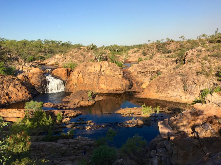 We were told by a few people at Bitter Springs that Edith Falls was beautiful and well worth stopping at on the way up to Kakadu, so after a relaxed pack up we headed off towards the falls. On the way there, we drove through Katherine, and stopped as we entered to get a photo of Kat in front of the sign, after a small modification to correct the spelling error that the town obviously made! We grabbed a few groceries before heading on to Edith Falls. The campground was awesome, set up the way they should be. The campsites were really well spaced, hidden amongst the trees, with big grassy areas behind each site. We unpacked and after a bit of food to give us energy, we set off on the short but steep walk to get up to the falls. They really were beautiful, with a large waterfall plunging into an inviting swimming hole below. We got changed and hit the water, keen to cool off after the hot walk up. We swam over to the falls, and tried to get as close as we could to them, but the force of the water kept pushing us back no matter how hard we tried. The water was cool but really refreshing given it was 30 degrees outside. After floating down a fast flowing chute in the rocks, we climbed out and headed up and over the rock face which gave us a great view above the falls, allowing us to see the pools that fed the waterfall. It was a magical site, and we could have sat there for hours watching the moving picture in front of us, but our stomachs had other ideas so we headed back to camp to have dinner.