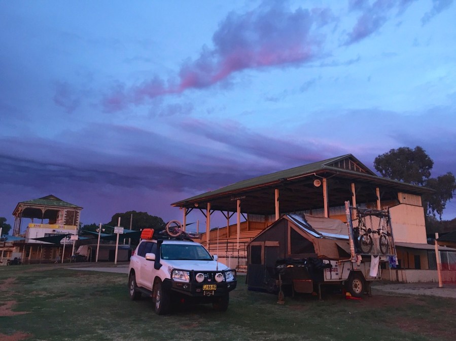 We woke the next morning to more sunshine, and the sound of horses trotting around the track. The stands provided a great place to not only enjoy our breakfast but also watch the horses training. Knowing we had a big drive ahead of us, we packed up quickly and drove off around 9:30am. By the time we swung by the supermarket to restock we didn’t leave Broken Hill until closer to 10:30am, and set off on what turned out to be our longest drive of the trip so far. Just over 600km later, we arrived in Nyngan and after a very efficient check in we drove down to a lovely big patch of grass by the Bogan River and set up before heading to the camp kitchen to reheat our spare pizza for dinner. It was a great kitchen right on the river bank, and there were a few people water skiing up and down the river so we enjoyed that spectacle over dinner. After dinner Em was playing on a tall stool and when she jumped down to head to bed landed awkwardly and hurt her ankle. It wasn’t the first time she had hurt her ankle on the trip so we hoped it would not be anything too serious. I carried her back to the tent and got her into bed as the rain started to fall.