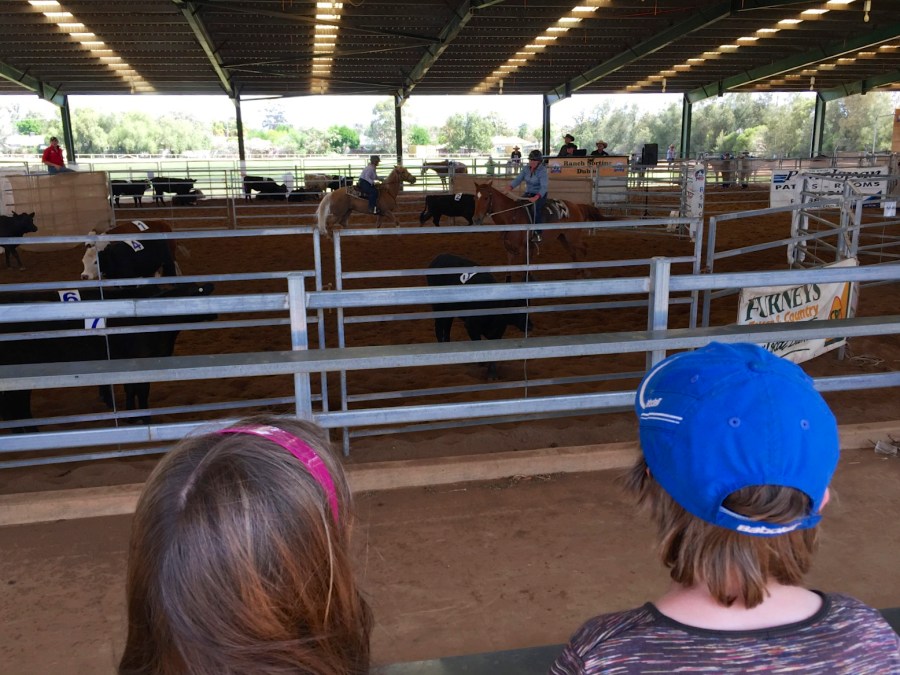 The next day Em seemed to be able to hobble around which was a relief as Kat and I were both getting pretty tired of carrying her around. We spent the morning at the pool and playground in the caravan park. The pool was pretty cold but that never stopped Em from getting in the water. We did a few exercises for her ankle before she finally took the plunge. I had been putting off getting fully in as I was not so excited about the cold water, but just as I was about to get in, Oli managed to stub his toe and soon his toe was nice and bloody. I took him back to camp to clean it up, skilfully avoiding the a swim in the antarctic pool. With both children now invalids, we were keen to find an activity that would keep everyone amused but not require the use of feet. Kat had found something at the local showground that looked good so, that afternoon we headed out there to watch a ranch sorting competition. The kids hobbled over to the stands where we sat for the next couple of hours enjoying the spectacle. It was surprisingly good and really exciting to watch. The competition involved two riders on horseback that would race against the clock to muster 10 cattle, one by one and in order from one pen to another. They each had a number on their backs and the judge would tell them which number to start with when the clock started. We really enjoyed it and decided it would be really fun to track down a rodeo some time to watch a few more of those competitions.
